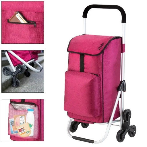 Praktyczny i pojemny wózek zakupowy z 6 kołami do łatwego poruszania się po schodach. Wózek posiada przestronną komorę główną o pojemności 30 litrów, ze sznurkiem i zamknięciem, przednią kieszeń termoizolacyjną (funkcja lodówki) i dodatkową kieszenią na suwak z tyłu. Usztywniane dno, wygodny uchwyt, górna klapa na klips, wodoodporny materiał wykonania to główne atuty wózka.