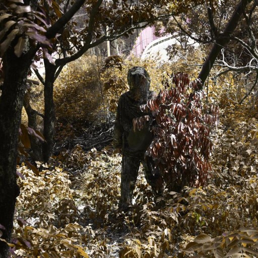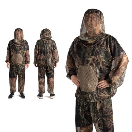Komplet z gęstej siatki w kamuflażu leśnym, składający się ze spodni i kurtki z kapturem i siateczką na twarz do szybkiego zakrycia normalnej odzieży myśliwskiej. Praktyczny, niedrogi i zajmujący mało miejsca.