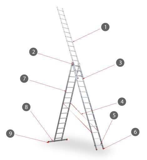 1. Wyjmowany element drabiny, dzięki któremu można przekształcić drabinę 3-elementową w dwie niezależne drabiny, które można użytkować osobno. Takie rozwiązanie znacznie podnosi użyteczność drabiny oraz zwiększa możliwości różnorodnych zastosowań. Drabina uniwersalna 3-elementowa to najbardziej uniwersalne rozwiązanie na rynku.