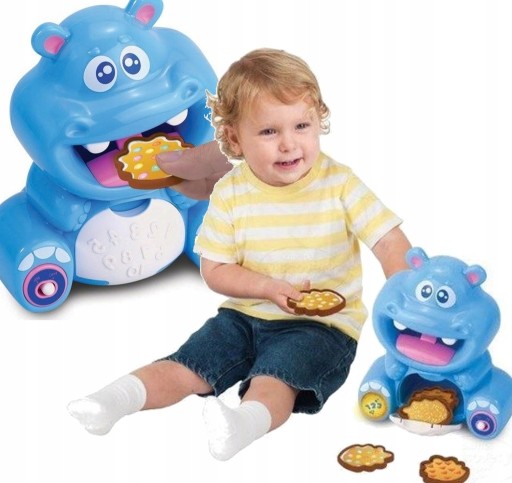 - Kiedy dziecko naciśnie na stópkę rozpocznie zabawę w liczenie oraz usłyszy zabawne dźwięki i melodie. Nakarm hipcia i powiedz ile jest w stanie zjeść ciasteczek.