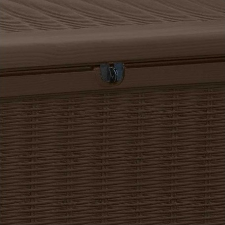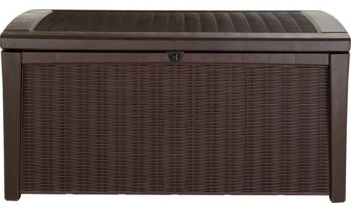 Cechy: - Skrzynia wykonana jest w całości z tworzywa sztucznego w odcieniu brązowym o strukturze naturalnego rattanu. - Zastosowanie plastiku pozwoliło uzyskać maksymalną odporność na warunki atmosferyczne i promieniowanie UV. - Pokrywa wyposażona jest w siłownik do automatycznego otwierania/zamykania skrzyni, przystosowana również do zamykania na kłódkę. - Wzmacniana pokrywa pozwala na niej usiąść, traktując ją jako dodatkowe siedzisko dla dwóch dorosłych osób (do 220 kg). - Bardzo pojemny schowek o maksymalnej ładowności wnętrza skrzyni do 50 kg. - Skrzynia jest 100% wodoodporna, łatwa w czyszczeniu i może stać na zewnątrz przez cały rok. - Solidna budowa oraz wysoka jakość gwarantują bezproblemowe i długotrwałe użytkowanie. - Doskonale nadaje się do przechowywania wszelkich akcesoriów ogrodowych. - Skrzynię montuje się sprawnie i szybko.