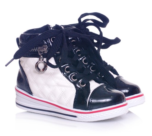*** Botki dziecięce pikowane po bokach, zapinane na wygodne suwaki od środka, sznurowadłami łatwo dostosujesz buciki na wyższe lub niższe podbicie. Czarne elementy lakierowane.