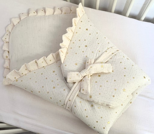 Rożek muślinowy z drukowanym wzorem z falbanką - BRUDNY RÓŻ ZŁOTE GWIAZDKI