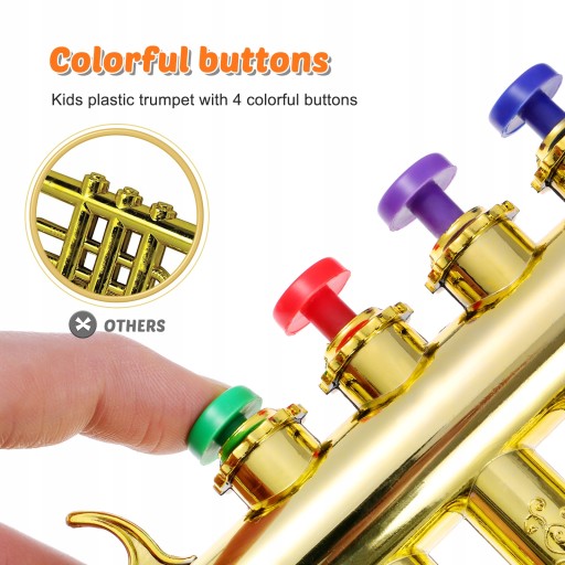Ta muzyczna trąbka zawiera klawisze oznaczone jasnymi kolorami, które ułatwiają grę.