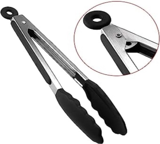 Szczypce kuchenne wykonane z tworzywa sztucznego oraz stali nierdzewnej. Poręczne i praktyczne, z antypoślizgowymi nakładkami na uchwytach oraz blokadą.