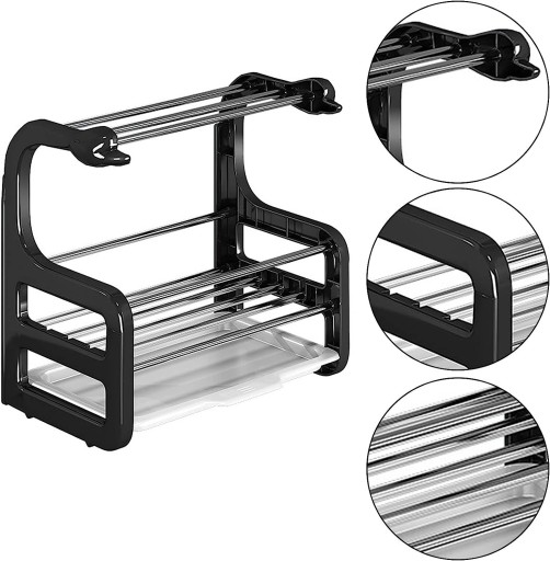 W skład organizera wchodzą również uchwyty na ręczniki i ściereczki. Zapewni to suchość twoich ścierek. Półka do przechowywania posiada wyprofilowane nóżki, dzięki czemu jest stabilna. Tacka ociekowa jest wyjmowana, aby ją umyć