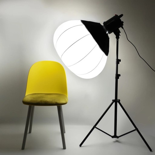 W zestawie znajduje się również SOFTBOX w kształcie kuli zapinany na rzep na składanym metalowym stelażu.