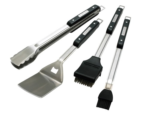 - Na zestaw składają się z 4 elementy: szczypce, szeroka łopatka z otwieraczem, silikonowy pędzelek oraz szczotka do czyszczenia rusztów z włosiem ze stali nierdzewnej.
