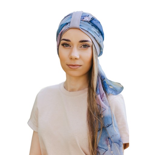 Nie wymaga formowania na głowie, wiążemy jedynie szal np w kokardke