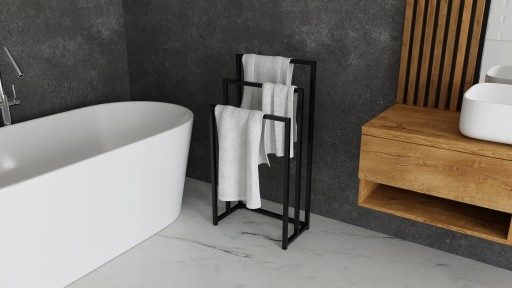 ✅Wysoka jakość wykonania - dzięki malowaniu proszkowemu stojak na ręczniki jest wyjątkowo trwały i odporny na różne warunki. Czarna powłoka nadaje stojakowi elegancki i nowoczesny wygląd. To doskonałe rozwiązanie dla osób poszukujących designerskiego akcentu.