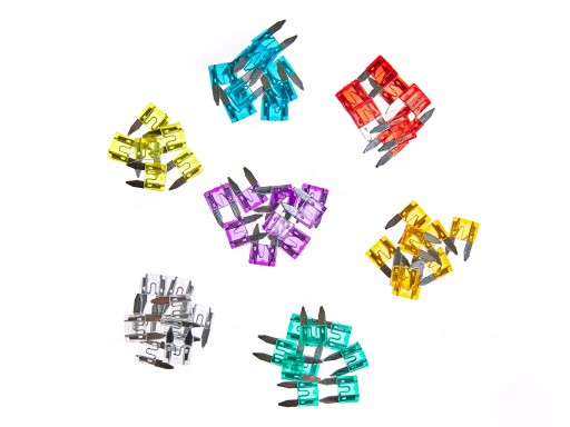 Zestaw zawiera 140 bezpieczników płytkowych w wygodnym pudełku pogrupowanych ze względu na natężenie w siedmiu oddzielnych przegrodach.