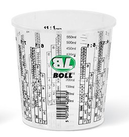 Uniwersalne pojemniki z przeźroczystego tworzywa z nadrukowaną podziałką umożliwiającą przygotowanie mieszanki w żądanej proporcji.