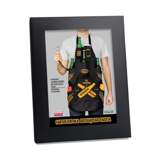 Kieszenie fartucha pomieszczą: 3 piwa (butelki 0,5 l), jedno małe piwo, otwieracz do butelek, telefon, musztardę i keczup. Do zestawu dołączono: otwieracz do butelek.