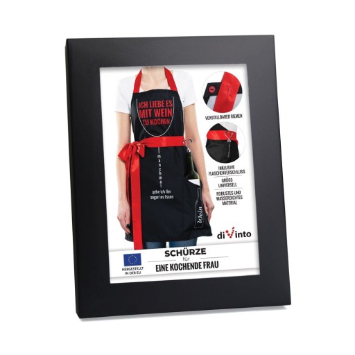 Gotowy do wręczenia na prezent bez konieczności dodatkowego pakowania. Napis na produkcie: Ich liebe es mit Wein zu kochen. Manchmal gebe ich ihn sogar ins Essen. Produkt w niemieckiej wersji językowej.