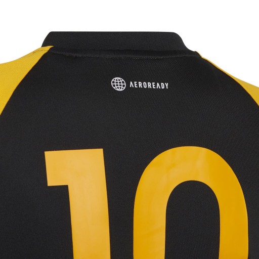 Nowa koszulka Adidas MESSI 10 JSY w kolorze czarnym z pomarańczowymi detalami. Po prawej stronie na torsie nadrukowane logo producenta, po lewej stronie detale nawiązujące do gwiazdy Inter Maiami i reprezantacji Argentyny Leo Messiego. Tył koszulki w kolorze czarnym z nadrukowanym numerem 10. Grafika na koszulce adidas odzwierciedla wartości Messiego, do których należą m.in. ambicja, szacunek, pokora. Koszulka wykonana została z materiałów w technologii AEROREADY, która pochłania wilgoć, pomagając zachować suchość. Koszulka o regularnym kroju, posiada prążkowany dekolt w kształcie litery V. Materiał wysokogatunkowy. Prać i czyścić zgodnie z zaleceniami producenta.