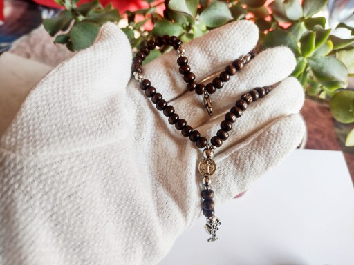 - Bransoletka wykonana została ręcznie z drewnianych koralików (6x4mm), elementów ze stali szlachetnej oraz krzyżyka i medalionu św. Benedykta.