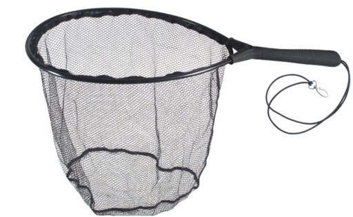 Podbierak pstrągowy firmy DRAGON z krótką rękojeścią, o wymiarach 30 x 40 cm, wyposażony w antypoślizgowy, plastikowy uchwyt.