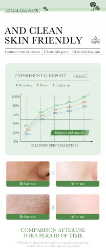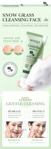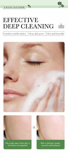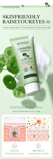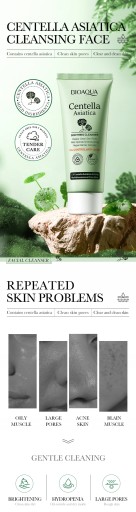 - BENEFITS:Foam is dense and delicate,deep into the pores,easily removethe dirt and makeup residue from the skin,cool and control the oil,add the essence of centella asiatica.