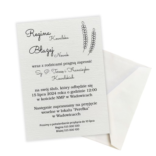 Zaproszenie jest wykonane na sztywnym białym teksturowanym papierze