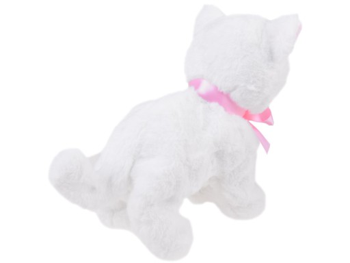 Mały słodki interaktywny kotek z różową kokardką może stać się przyjacielem każdego dziecka. Mały biały rozrabiaka po dotknięciu ręką lub klaśnięciu w dłonie wydaje kocie dźwięki oraz robi akrobatyczne ruchy. Przecież każdy maluch marzy o czworonogim przyjacielu z którym będzie mógł się bawić. Ale ciężko jest spełniać wszystkie pragnienia naszych pociech zwłaszcza jeśli marzą o prawdziwym czworonogu, a my nie mamy możliwości, aby mieć takiego zwierzaka. Dlatego, aby połowicznie, a chociaż minimalnie spełnić ich pragnienia proponujemy Państwu tego uroczego pluszowego kotka psotka. Kotek jest obszyty pluszowym mięciutkim futerkiem ma uroczy różowy plastikowy nosek oraz wesołe plastikowe niebieskie oczka.