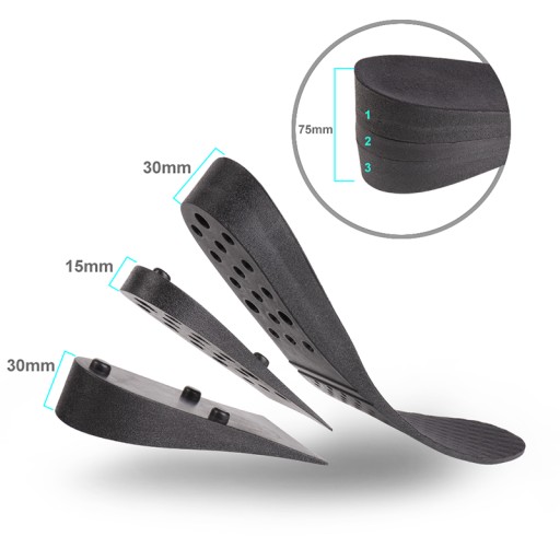 - Wykonane z miękkiego tworzywa, posiadają regulowaną wysokość. Każda wkładka składa się z trzech części. Możemy więc zwiększyć wzrost o 3 cm lub o 4,5 cm, a nawet o 7,5 cm.