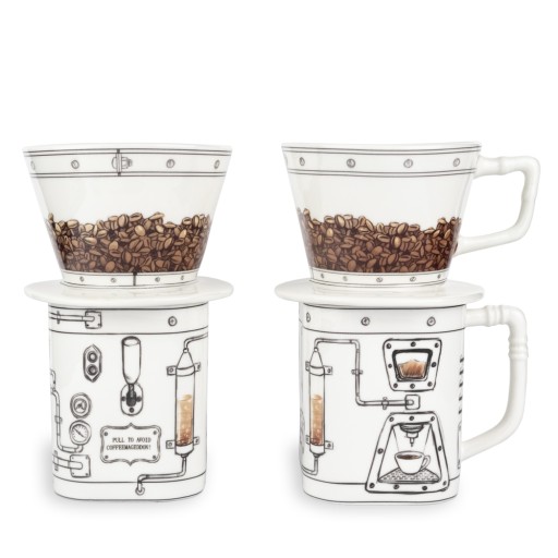 Wyobraź sobie co by było gdyby w Twoim świecie nagle zabrakło kawy… Poranki bez małej czarnej. Życie bez kofeiny w organizmie. Koszmar, dramat, szok! Nadciąga COFFEEMAGEDDON! Lecz dopóki kawa w dłoni, dopóty spokój w sercu. Coffeemageddon powstrzymasz zestawem drippera i kubka do parzenia aromatycznej kawy bez fusów, z nadrukiem osobliwej aparatury.