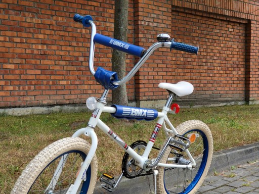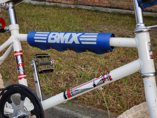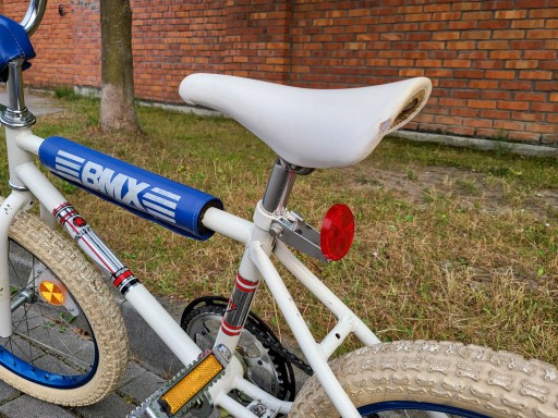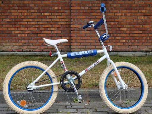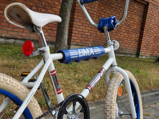 BMX Universal Romet z 1988 roku. Rower pochodzi z naszej kolekcji, odnaleziony 3 lata temu w Krakowie przez spadkobiercę mieszkania i odkupiony przez nas bezpośrednio od niego. Przepięknie zachowany egzemplarz, patrząc po stanie napędu oraz opon, prawie nie używany. Całkowicie oryginalny i w takiej konfiguracji w jakiej wyszedł z fabryki. Rower po zakupie został jedynie umyty, nie przechodził żadnych prac restauracyjnych, oraz serwisowych. To co czyni ten rower niezwykle rzadkim to to że jest to produkt pod marką Universal a nie Romet (Universale były to rowery produkcji Romet produkowane tylko i wyłącznie na eksport), kolejna praktycznie nie spotykana rzecz, posiada on oryginalnie malowane obręcze kół na niebieski metaliczny kolor w związku z czym nie został wyposażony w przedni hamulec który uszkadzałby farbę. Rower wyposażony jest w korbę tzw. jednoczęściową co również było rzadkością w tamtych czasach w fabrykach Romet. Oprócz tych walorów, rower jest także w rzadkim zestawieniu kolorystycznym dla BMX z tamtych lat. Powyższe cechy czynią go bardzo dobrą lokatą kapitału gdyż takich rowerów praktycznie nie oraz nietuzinkowym uzupełnieniem kolekcji. Posiada pełne wyposażenie: dzwonek, podwójny niebieski wykonany ze skaju ochraniacz na kierownicy, niebieski wykonany ze skaju ochraniacz na ramę, siodełko z białym poszyciem ze skaju, biały przedni oraz czerwony tylny odblask S.I. Solidarność Grudziądz, niebieskie chwyty, pedały metalowe z doczepianymi odblaskami, odblaski kół S.I. Solidarność Grudziądz, stopka. Opony z roku 1988 przepięknie zachowane lecz do jazdy już się nie naddają gdyż są przez kolor a w zasadzie składniki użyte do produkcji są skamieniałe, ciśnienie oczywiście trzymają ale myślę że próba przejażdżki na nich skończyła by się ich uszkodzeniem. Oczywiście jeżeli ktoś chciałby na nim jeździć najlepiej byłoby zrobić kompletne czyszczenie i smarowanie napędu gdyż przez lata postoju smar na pewno stracił część swoich właściwości, niemniej jednak wszystko jest sprawne i działające. Dla osób zainteresowanych mogę podesłać więcej zdjęć.