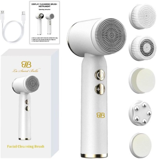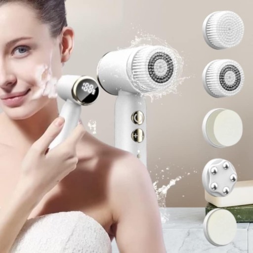 Innowacyjny system oczyszczania twarzy 6 w 1 z wyświetlaczem mocy LED to urządzenie do oczyszczania twarzy z sześcioma wymiennymi główkami szczoteczki o różnym kształcie i miękkości, przeznaczonymi do oczyszczania skóry za pomocą sześciu różnych czynności: