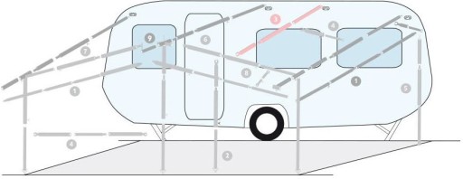 Uniwersalna rurka stelaża z haczykiem przedsionka do mocowania poziomego na dachu. Dodatkowe belki dachowe pomagają wzmocnić konstrukcję stelaża. Szczególnie zalecany jest przy dużych rozmiarach oraz cięższych namiotach. W rezultacie stelaż jest stabilniejszy oraz bardziej odporny na warunki pogodowe takie jak wiatr oraz deszcz.