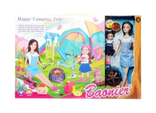 Twoja lalka wraz z córką jadą na kemping. Pomóż im przetrwać ten czas. Rozbij namiot i rozpal ognisko. Zestaw zawiera m.in.: 2 lalki, namiot, zjeżdżalnię, hulajnogi, rolki, walizkę, skrzypce, akcesoria kuchenne. Produkt zapakowany w kartonowe opakowanie.