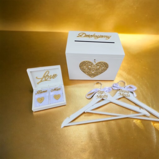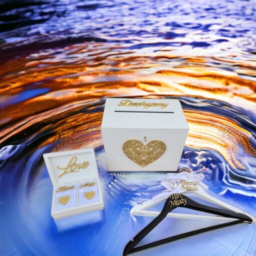 свадебный набор, коробка для конвертов, обручальные кольца, вешалки.