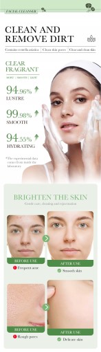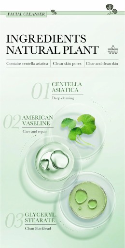 - BENEFITS:Foam is dense and delicate,deep into the pores,easily removethe dirt and makeup residue from the skin,cool and control the oil,add the essence of centella asiatica.