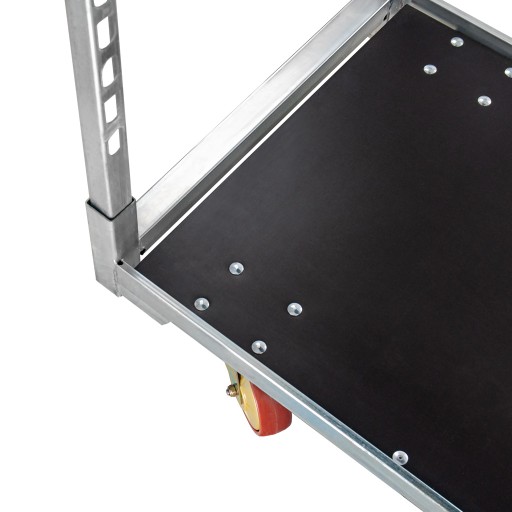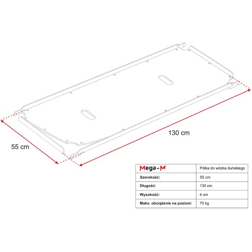 Półki do wózków duńskich firmy Mega-M wykonane są z płyty (sklejki) wytrzymałej i odpornej na działanie czynników atmosferycznych. Rama półki wykonana jest ze stali ocynkowanej i posiada zaczepy, dzięki którym z łatwością można regulować wysokość półek. Dodatkowa półka umożliwia lepsze zagospodarowanie dostępnej przestrzeni wózka duńskiego.