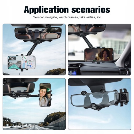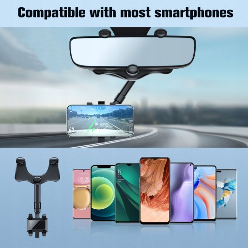 Uniwersalny uchwyt do telefonu komórkowego 360° wstecznego do montażu lusterka samochodowego: konstrukcja obrotowa o 360°, możesz obracać uchwyt pod dowolnym kątem, aby uzyskać najlepszy kąt widzenia. Długość ramienia można cofać o 0-5 cm bez blokowania wzroku. Uzyskasz bardziej komfortowe i bezpieczne doświadczenie użytkownika.