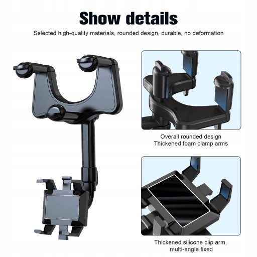 Ulepszona wysuwana konstrukcja czterech pazurów: Czterech pazurów konstrukcja uchwytu do telefonu komórkowego lustra wstecznego, bez względu na to, jak surowa jest droga, telefon komórkowy można mocno zamocować. Działa ze wszystkimi telefonami i wszystkimi modelami samochodów.