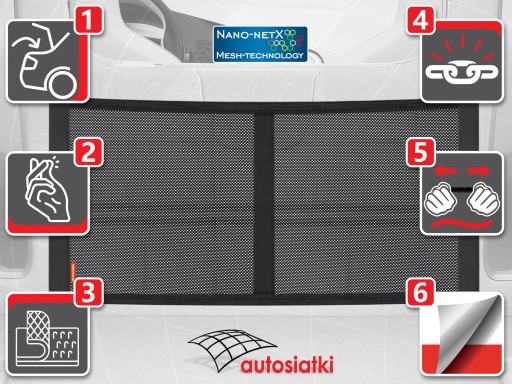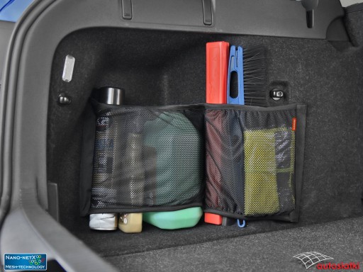 To wytrzymała siatka Nano-NetX obszyta po bokach i na środku taśmą typu rzep. Na górze i dole wykończona elastyczną gumą, która umożliwia dopasowanie siatki do przewożonych przedmiotów. Zastosowany materiał Mesh-Technology zabezpiecza przed wypadnięciem nawet niewielkie przedmioty. Przegroda dzieląca siatkę umożliwia rozdzielenie akcesoriów. Płotek mocuje się do wykładziny w lub tapicerki w bagażniku auta.