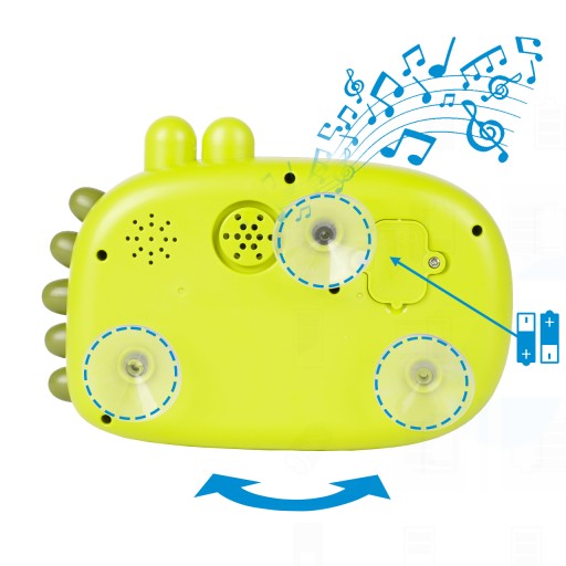 - w trakcie wytwarzania bąbelków dinuś gra wesołą melodię- jest ich kilkanaście (po ponownym naciśnięciu guzika melodia wyłącza się, a zabawka nadal robi pianę)