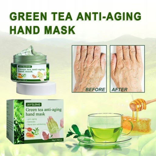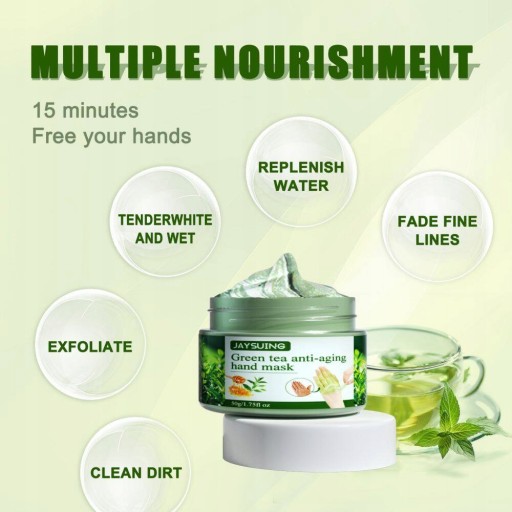 - Green tea and other essences gives the skin abundant nutrition. Moistening your hands, when the skin absorbs the essence and forms the film, you can peel gently for taking away the old skin cutin, give you soft and smooth hands.