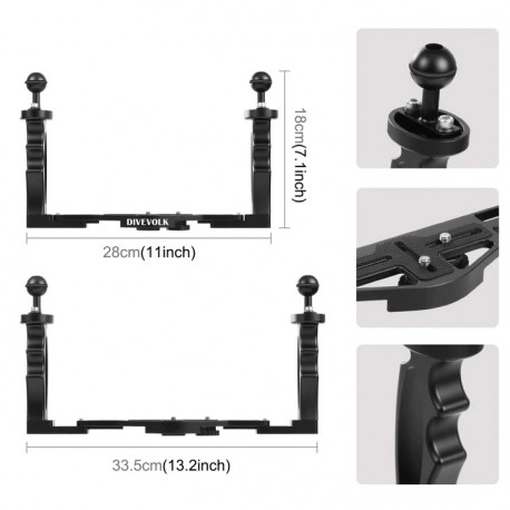 Uniwersalna regulowana podstawa do kamerek sportowych lub obudowy DIVEVOLK SeaTouch 4 Max. Posiada podwójny uchwyt zakończony standardowymi 1 calowymi kulkami. Podstawa wykonana z aluminium, a uchwyty z lekkiego i trwałego poliwęglanu.