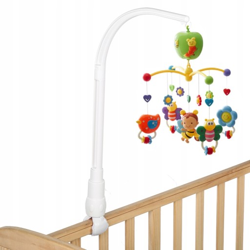 - Wszechstronne mocowanie: uchwyt mobilny na łóżeczku, w łóżeczku dziecięcym lub na stole do przewijania, również z tyłu krzesła. Przyciąga uwagę dziecka i sprawia, że dziecko jest spokojne.