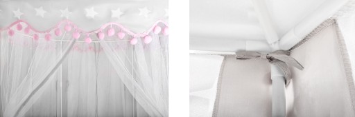 Wejścia są zasłonięte półprzezroczystymi, jasnymi firanami, które doskonale komponują się z pozostałą częścią namiotu; gardinki można przewiązać bądź udrapować przy pomocy ozdobnych tasiemek; zastosowane rozwiązanie wraz z kokardkami dodaje uroku, a także urozmaica zabawę.