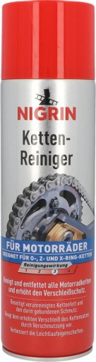- NIGRIN Środek do Czyszczenia Łańcuchów jest niezbędnym preparatem do regularnej pielęgnacji łańcuchów napędowych typu O-ring, Z-ring, X-ring. Usuwa stary, zanieczyszczony smar łańcuchowy i powstałe w nim zabrudzenia, dzięki czemu zapewnia prawidłową i płynną pracę łańcucha.