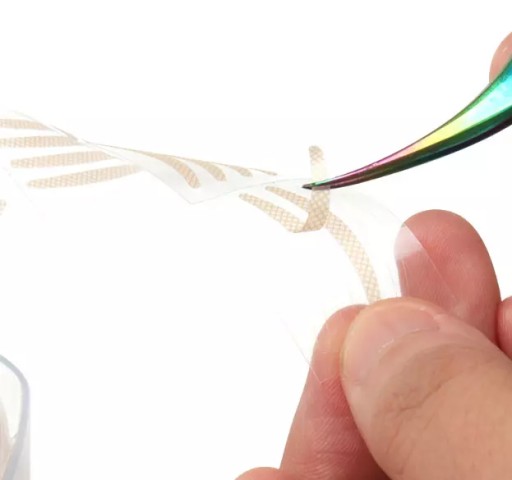 Należy dokładnie oczyścić i odtłuścić powiekę, następnie usunąć pasek z rolki. Przyklej taśmę powiekową w środku załamania powieki, lekko dociśnij i nałóż makijaż.