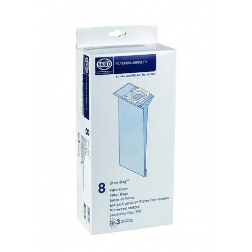 Komplet zawiera 8 sztuk, 3-warstwowych worków filtrujących z kapslami Ultra Bag™ o poj. 3l do odkurzaczy serii SEBO Airbelt K