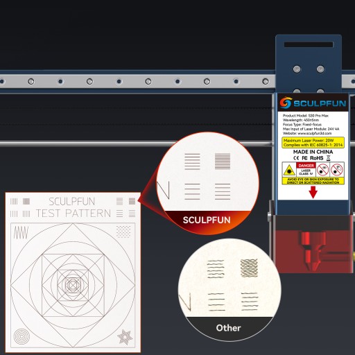 Dokładność cięcia klasy przemysłowej: Seria S30 Pro Max wykorzystuje niezwykle wytrzymałą i precyzyjną oś X prowadnicy liniowej, dzięki czemu jest to dokładność grawerowania klasy przemysłowej. Porównując małe detale grawerskie, seria S30 Pro Max nie ma falistego wzoru, który pojawia się w zwykłych grawerkach.
