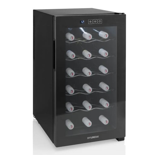 Chłodziarka na wino HYUNDAI o łącznej pojemności 48 litrów pomieści do 18 butelek wina (w zależności od wielkości i rozmiaru butelki). Całkowitą przestrzeń dzieli 5 chromowanych półek.