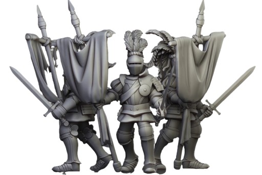 Oferujemy zestaw trzech figurek Imperial Guard with hand weapons and shields Command Group (Sunland Knights on foot autorstwa Highland Miniatures) wydrukowany na drukarce żywicznej.
