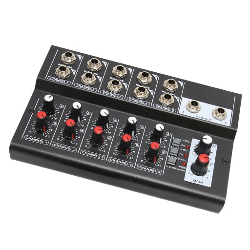 ⏺ Z 2 głównymi pokrętłami głośności: 10-kanałowy mikser stereo z 2 głównymi pokrętłami głośności do regulacji głośności wyjściowej. Obsługuje wejście mikrofonowe lub liniowe (5-kanałowe stereo i 10-kanałowe mono), regulując przełącznik. Do mikrofonów pojemnościowych można jednocześnie podłączyć 10 kanałów.