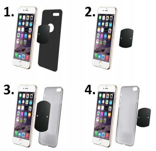 Zdejmij tylną obudowę telefonu, przyklej metalową płytkę, załóż tylną obudowę telefonu. Uchwyt będzie utrzymywał telefon, a płytka nie będzie widoczna.