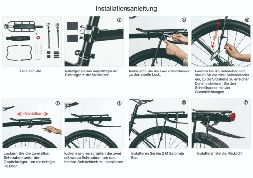Zakres dostawy: siedzisko * 1, sztyca * 2, rama boczna * 2, błotnik * 1, reflektor * 1, śruby, przekładki